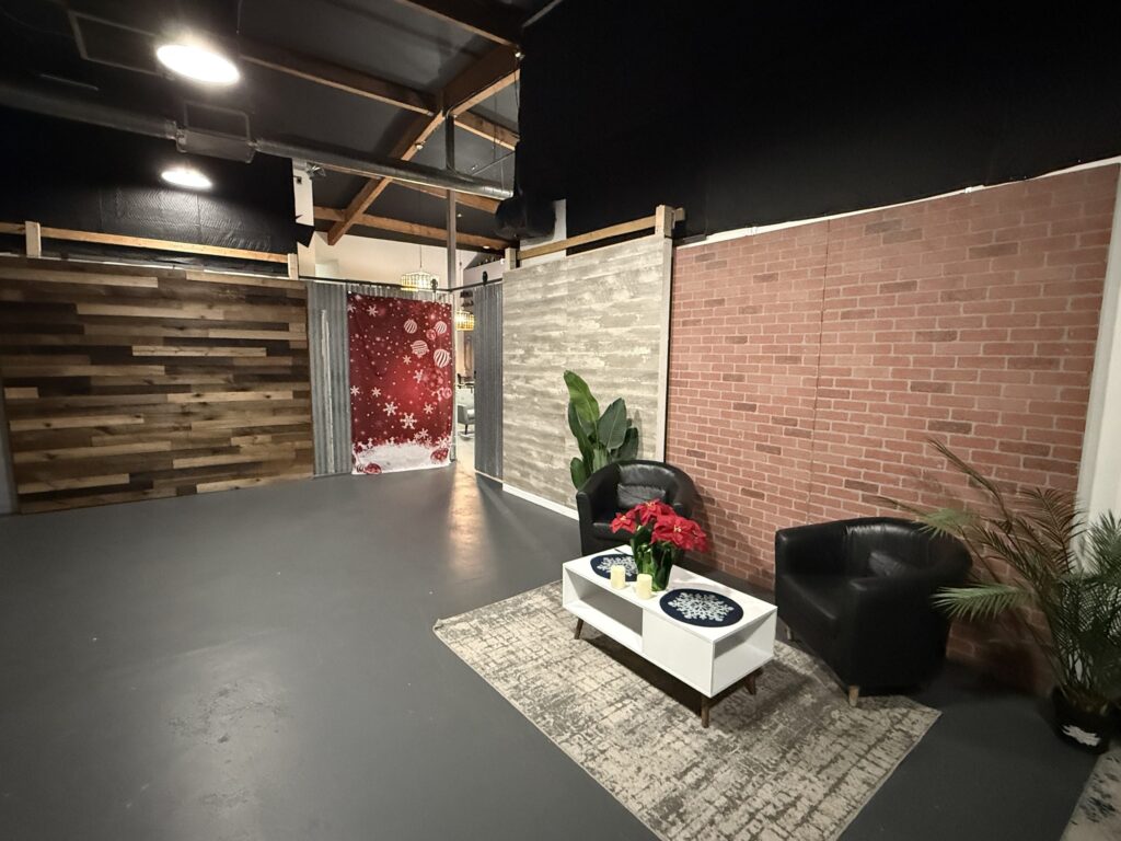 We offer several shooting locations on site including 2 large suites, co-working spaces, common areas, frosted glass garage bay door, outdoor areas and a large garage glass garage door for natural light shoots. Our 2 suites have over 1600 total sq feet of shooting space, including a 25×20 foot cyclorama wall with a bay door for vehicle access. Extra high ceilings give you headroom to set lights high if needed. Plus a co-working desk space for post-processing or editing your projects. Our contemporary furniture can be used for meeting clients, art directors or props to shoot with.
