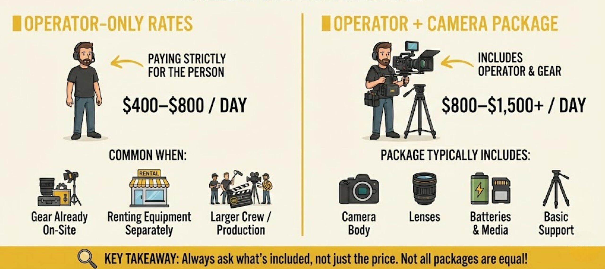 One of the biggest reasons camera operator pricing varies is whether gear is included.